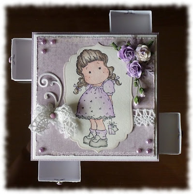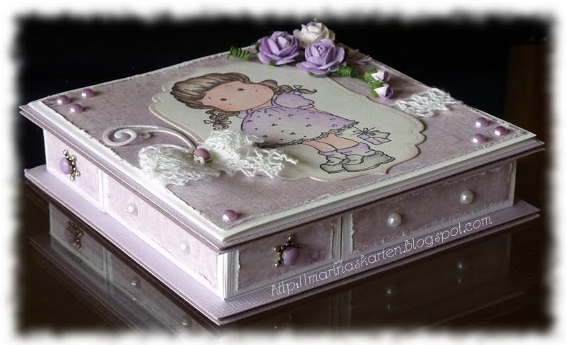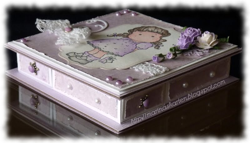 I have used my box for Tilda with a small gift, she colored with watercolor pencils stamped with spelli and wipe the edges with Milled Lavender.